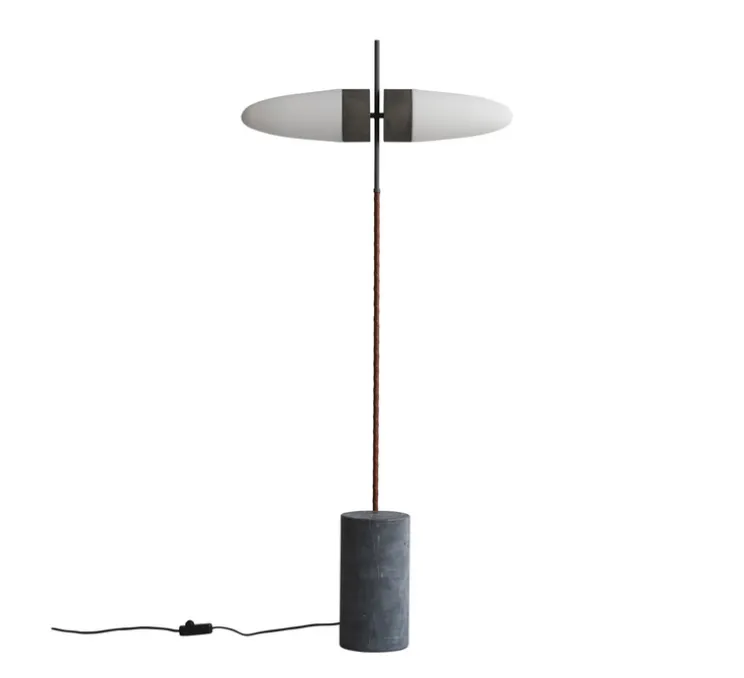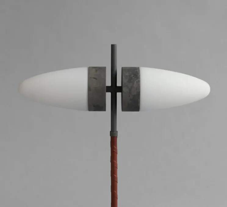 Le corps est composé d’une base en marbre gris non poli, d’un bras de lampe en verre oxydé, d’un bras de lampe en aluminium oxydé recouvert de cuir filé de couleur cognac, et d’une partie supérieure en aluminium oxydé qui contraste avec la lumière translucide.