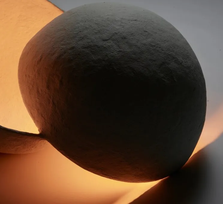 Le luminaire Earth se présente sous la forme d’un abat-jour fait de deux demi-sphères en papier mâché cachant la source lumineuse et d’un câble avec interrupteur.