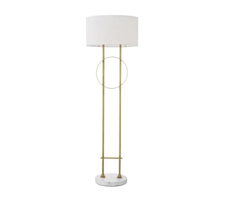 Caractérisé par un jeu de lignes géométriques, le socle en laiton antique confère à ce lampadaire contemporain une allure élégante et un air de luxe. Il repose sur un socle circulaire en marbre blanc et est fourni avec un abat-jour ovale en tissu blanc cassé. Avec une largeur de 49 cm et une hauteur de 157 cm, il possède des proportions imposantes qui en font une pièce maîtresse visuelle.