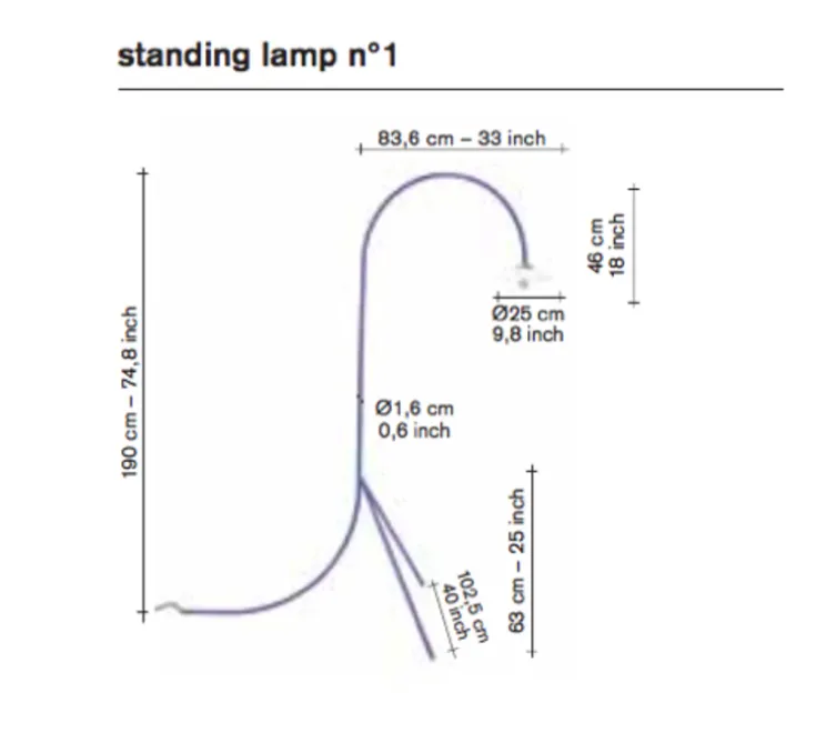 Le lampadaire n°1 mesure 190cm de haut. Le diamètre de l’abat-jour est de 25cm. L’ampoule E27 n’est pas fournie. La longueur du câble est de 5,3m.