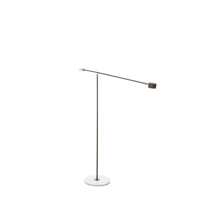 Le luminaire T-Lamp est composé d’une base circulaire en marbre, d’un long corps tubulaire en métal et d’un bras tubulaire pivotant avec d’un côté un poids en mabre circulaire et de l’autre une tête métallique circulaire intégrant la source lumineuse. S’inspirant de l’univers d’Alexander Calder, T-Lamp est gracieux et mouvementé. Le lampadaire T-Lamp se pose aisément dans une pièce de vie, un bureau ou un coin lecture.