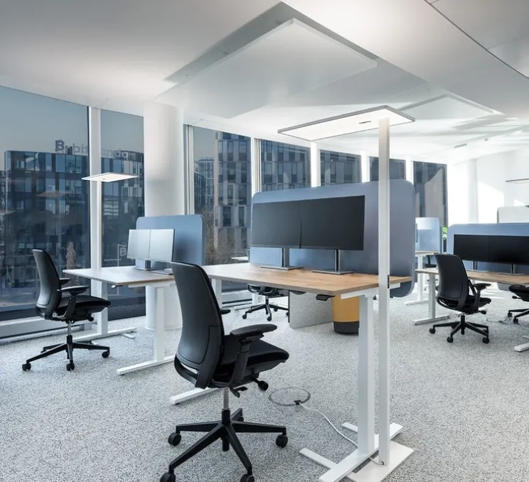 Task offre un éclairage direct et indirect parfaitement équilibré grâce à la technologie LGP-Body (Light Guiding Prism) et à des platines dédiées, offrant une luminosité maximale et un rendu homogène sur toute la surface. Ce luminaire est spécialement conçu pour les postes de travail, répondant aux normes DIN EN 12464-1 pour le travail sur écran. Intégrant des fonctionnalités avancées telles qu’un capteur infrarouge de présence et de luminosité, ce luminaire offre un confort d’utilisation optimal. Avec un réglage automatique de la luminosité, une commande TOUCH DIM incluse et une zone de détection de ø 4,5 m au sol, vous bénéficiez d’un éclairage personnalisé et économe en énergie.