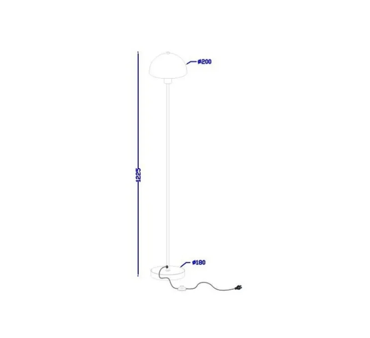 La lampe mesure 125 cm de hauteur et 20 cm de diamètre. Le câble mesure 2 m et contient le bouton on/off.