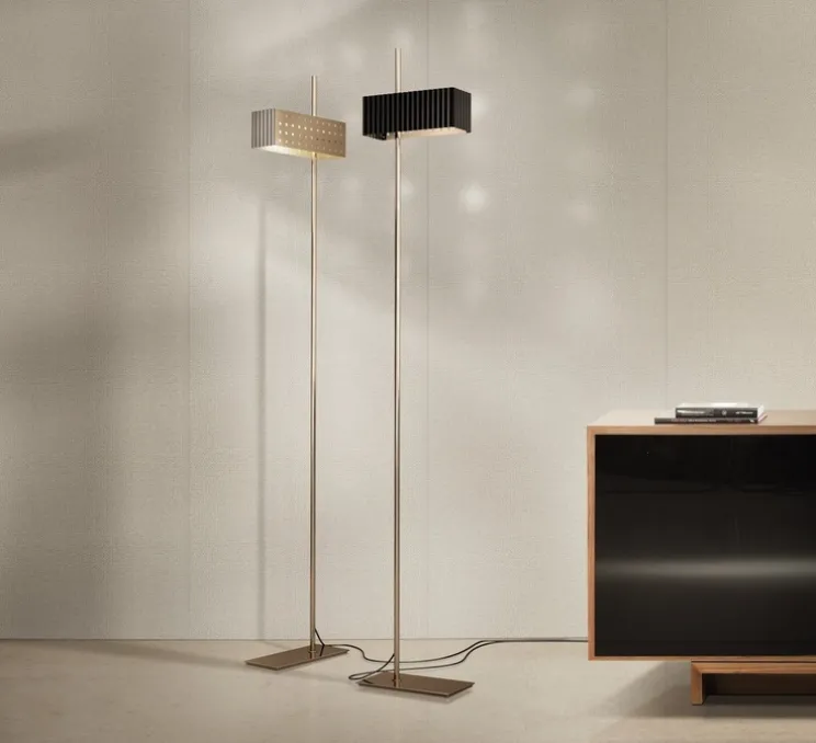 Ce lampadaire existe en deux couleurs : blanc et noir, en deux finitions : laiton et Chrome et en deux hauteurs : 178 cm et 198 cm.