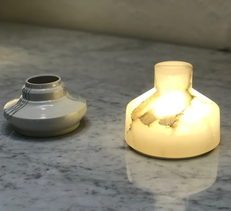 Cette petite lampe est un bel objet de lumière. Travaillée délicatement en albâtre, elle ajoute un design précieux à un intérieur.