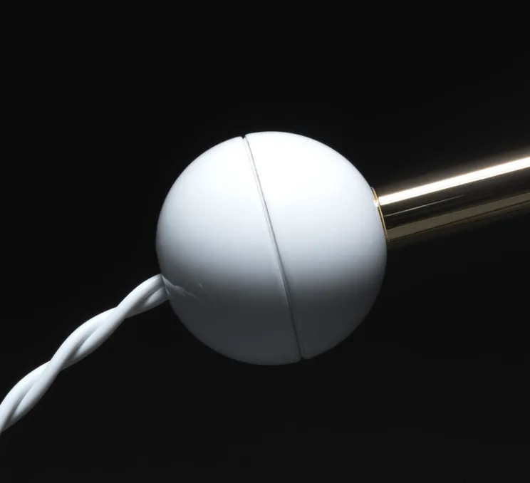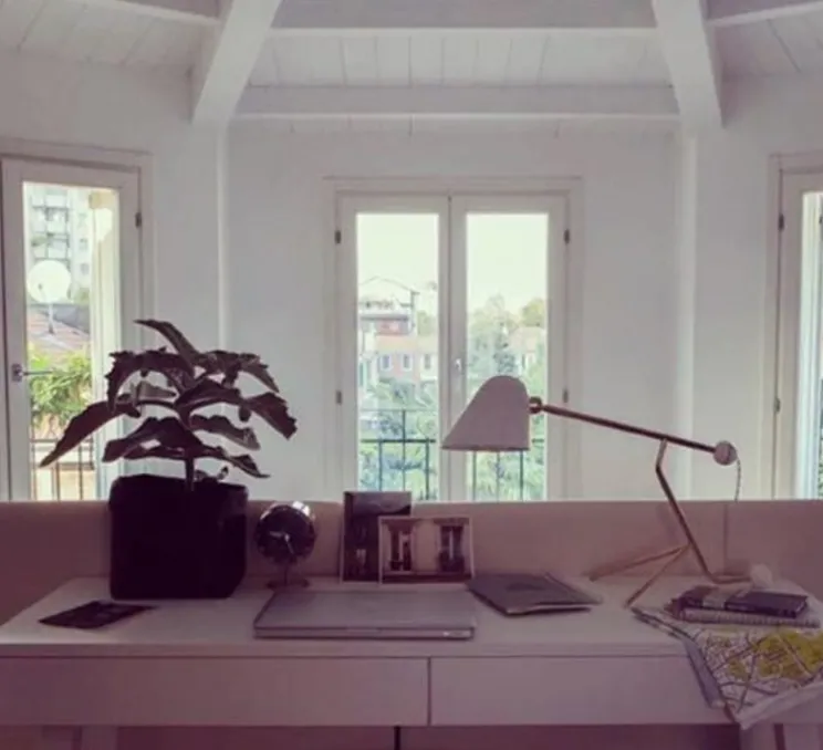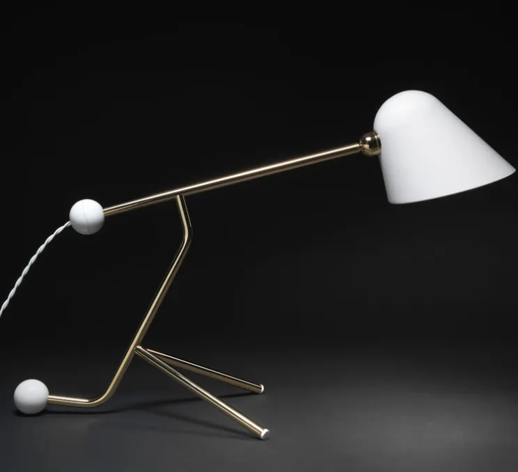 Abat-jour et détails en blanc brillant et structure en laiton pour une touche de rétro chic.