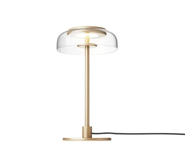 La lampe est équipée d’un module LED remplaçable soigneusement intégré, qui projette la lumière vers le haut dans un disque métallique doré. Cette caractéristique crée une lueur chaleureuse et enveloppante qui illumine l’abat-jour en verre transparent. Le contraste entre le métal doré et le verre transparent ajoute une touche d’élégance à la lampe.