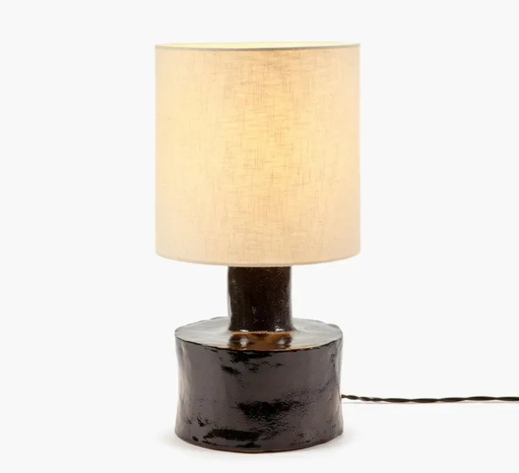 La lampe à poser se compose donc d’une base en céramique cylindrique et d’un abat-jour crème à la matière texturée.