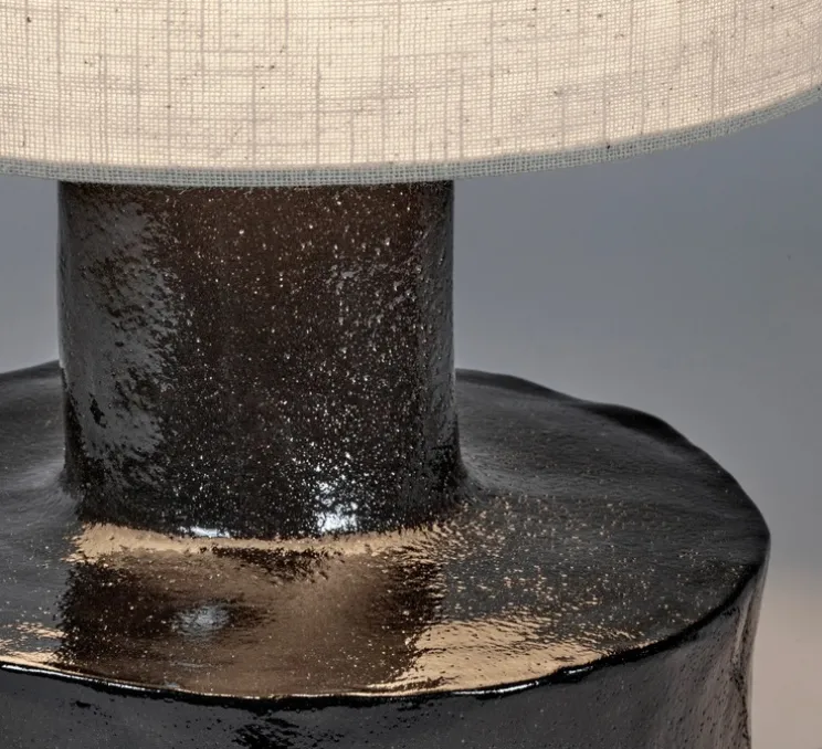 La couleur noir profond contraste avec l’abat-jour clair et les matières s’opposent pour donner de la présence à la lampe. Ce luminaire s’intègre facilement dans des pièces de vie comme une chambre ou un salon. Il se dispose idéalement sur une commode, une table ou un bureau.