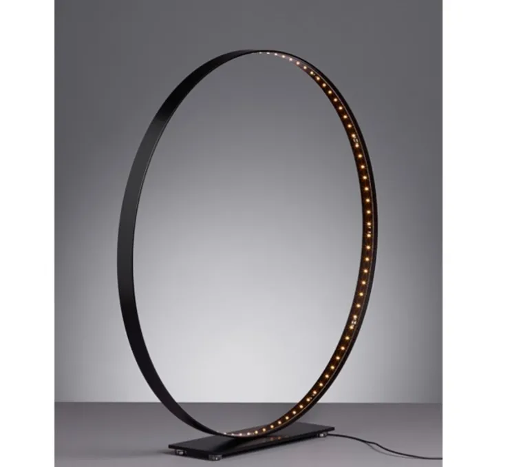 Le diamètre de l’abat-jour circulaire est de 46 cm. La hauteur de l’ensemble est de 64 cm (base comprise) et la profondeur de 10 cm. Classe 3. Muni d’un variateur. Garantie 5 ans.