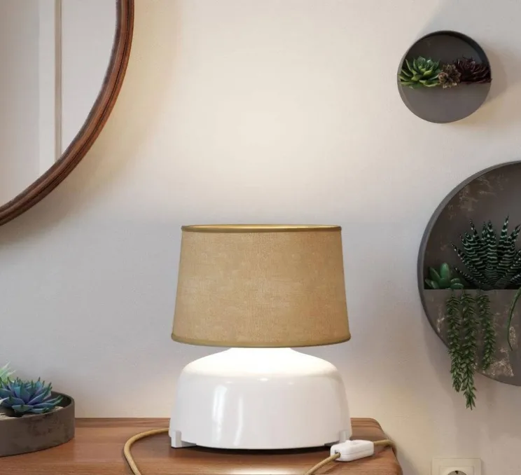 Fabriquée en Italie, cette lampe élégante et fonctionnelle, pensée en 2024, associe la céramique blanche brillante et le tissu pour un rendu artisanal et intemporel.