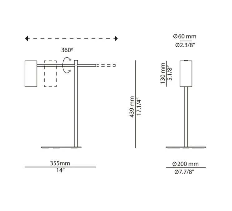 La structure de la lampe mesure 43,9 cm de hauteur, sa base 20 cm de diamètre et sa tête rotative a un diamètre de 6 cm et une hauteur de 13 cm. La lampe a une profondeur de 35,5 cm. L’ampoule E14 LED d’une puissance maximale de 20W n’est pas fournie mais est recommandée afin d’optimiser l’éclairage. Possède un interrupteur on/off. Non dimmable.