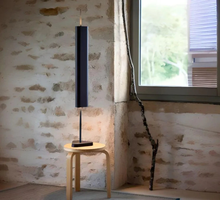 La forme d’Emi est discrète et longiligne, c’est un exemple de design industriel où l’objet disparaît au profit de l’outil. Le flux lumineux provient du dessus de la lampe, comme une puissance qui émerge. Grâce à ce type d’éclairage, le luminaire se fond dans la pièce lorsqu’il est allumé. La source n’est pas éblouissante et ne se laisse deviner qu’une fois que la lumière jaillit.