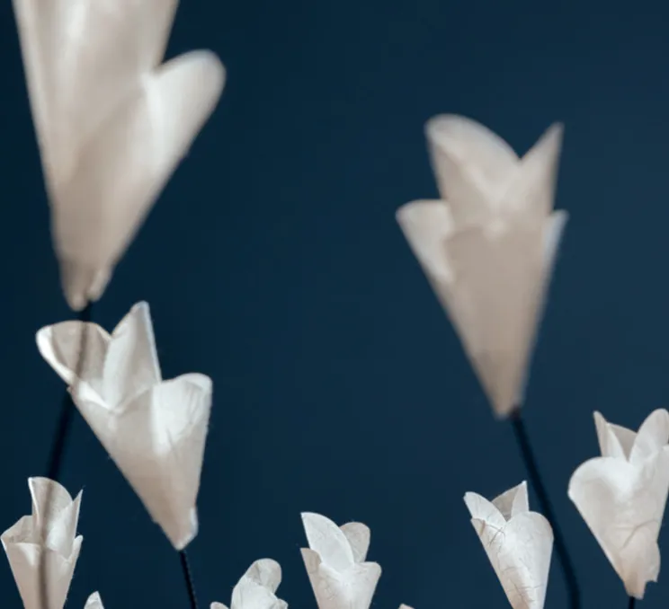Le design de For You se distingue par sa tige en tissu bleu, que vous pouvez modeler selon vos envies, et sa base en laiton élégante. Les pétales en papier de riz blanc diffusent une douce lumière ambrée, idéale pour créer une ambiance chaleureuse sur une table de chevet ou une console. Grâce à sa conception unique, cette lampe devient un véritable objet décoratif tout en offrant une fonction lumineuse.
