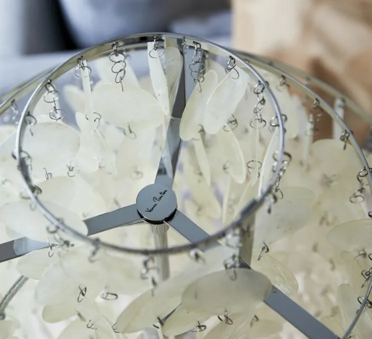 La série de luminaires Fun traduit l’enthousiasme du célèbre designer danois. Avec la Fun 1TM, Panton met en scène une lampe audacieuse créée pour être vue et entendue. Le doux bruit des pastilles qui s’entrechoquent entre elles, crée ainsi une atmosphère chaleureuse grâce à la nacre presque translucide. Les pastilles de nacres sont suspendues sur un cadre métallique à deux anneaux en métal, ce qui crée un jeu de lumière surprenant une fois allumée.