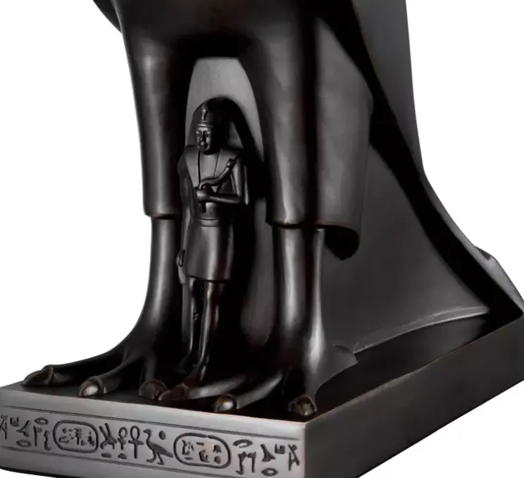 La lampe à poser Horus d’Eichholtz s’inspire directement d’une sculpture méta-greywacke représentant le dieu Horus protégeant le roi Nectanebo II. Cette sculpture, datant de 360-343 avant J.-C., est une pièce remarquable de la collection d’art égyptien du Metropolitan Museum of Art de New York. Elle illustre le lien profond entre le pharaon Nectanebo II et Horus, le faucon, dieu de la royauté, au point que Nectanebo II était surnommé « Nectanebo le faucon ».