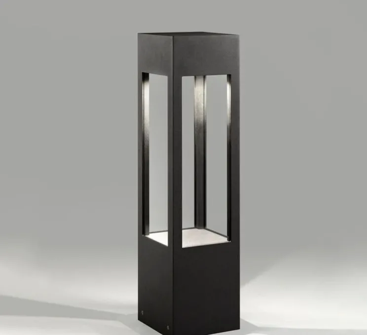 Le luminaire se présente sous la forme d’un prisme rectangulaire, encadré en aluminium massif laqué noir. La source de lumière LED n’est pas directement visible et la lumière tombe le long de l’intérieur de la lampe et illumine tout autour de la lampe.