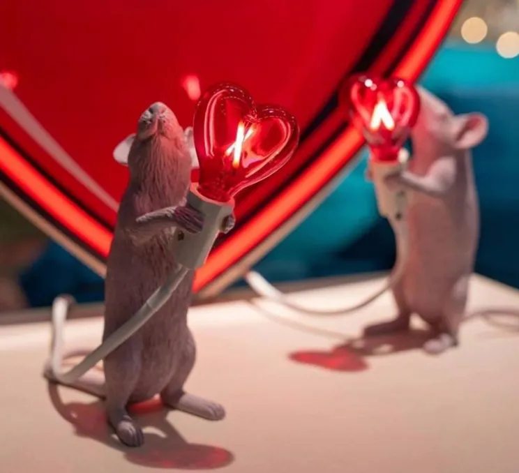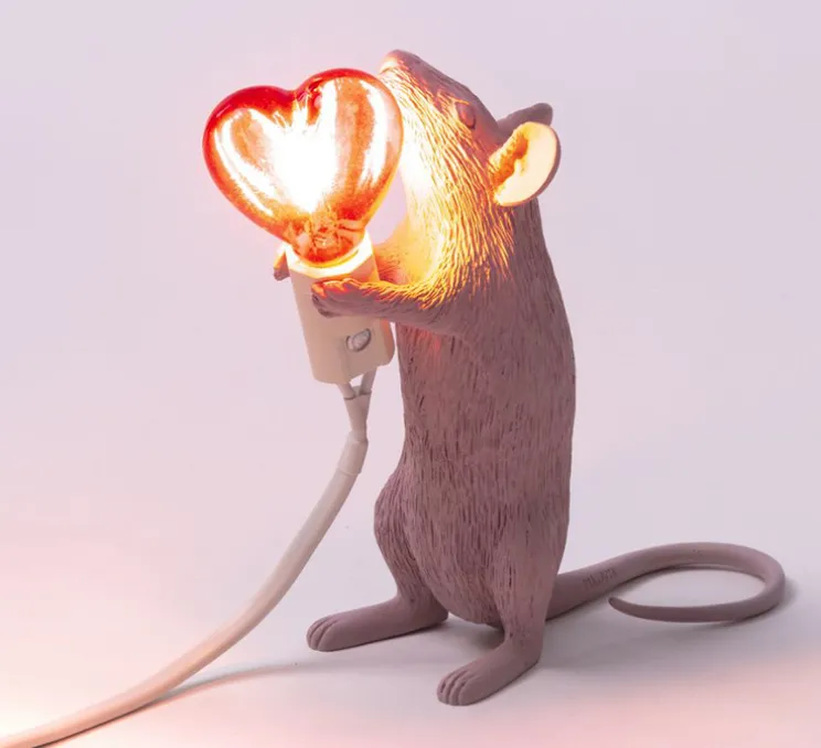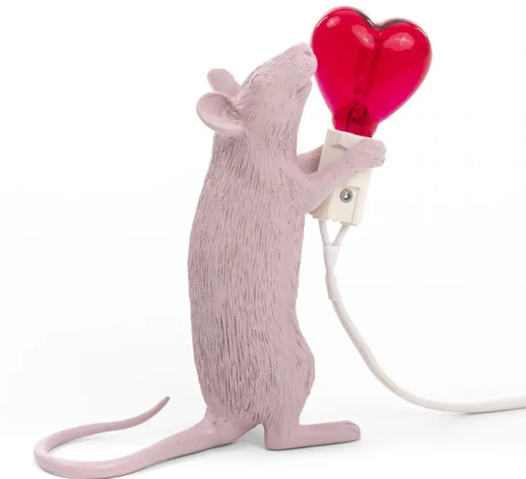 Mouse Lamp Step Standing est une lampe à la forme d’une souris au pelage rose, debout sur ses pattes arrière, tenant entre ses pattes avant une ampoule rouge en forme de cœur et son câble blanc. Telle une étrange sculpture lumineuse, Mouse Lamp Step Standing se fait remarquée dans chaque intérieur, qu’elle soit posée sur une table de nuit ou cachée entre deux livres sur une étagère.