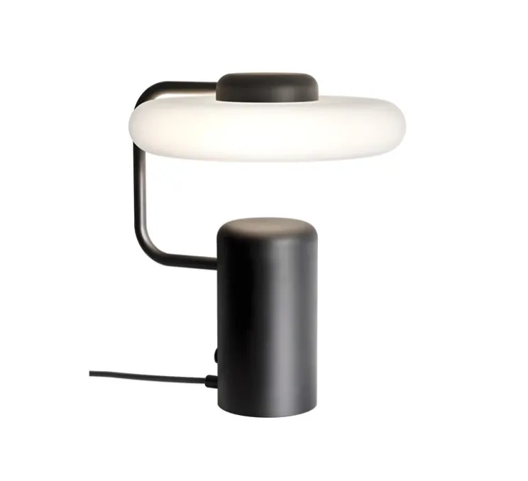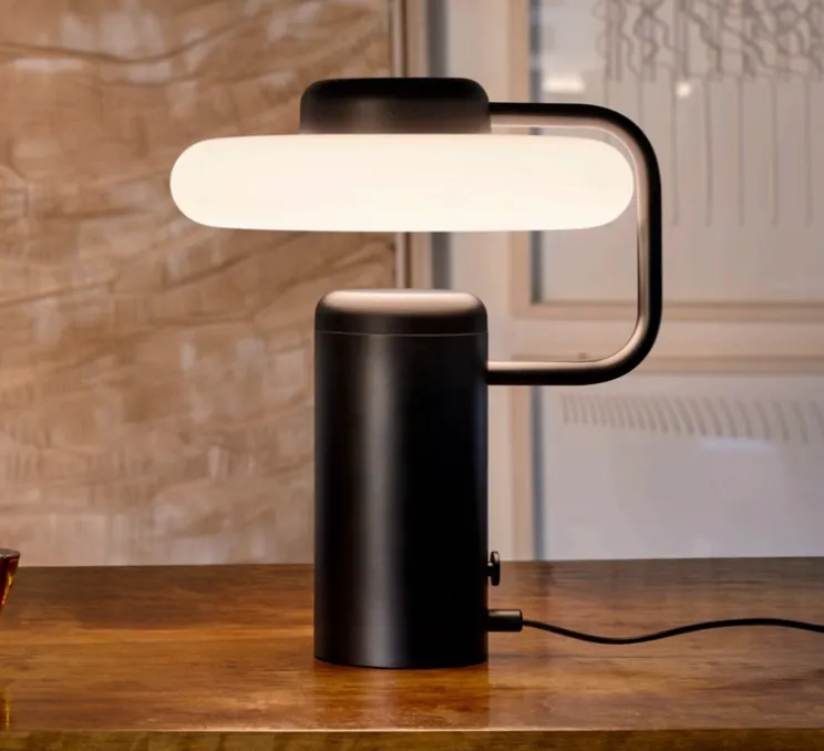 Compacte et sculpturale, Tratto met la lumière à portée de main. Le diffuseur en verre opalin, suspendu au-dessus d’une base cylindrique en métal peint noir, diffuse une atmosphère douce et sereine. La courbe de la structure apporte légèreté et équilibre visuel, ce qui en fait un choix idéal pour les tables de chevet, les étagères ou les coins lecture d’un intérieur contemporain.