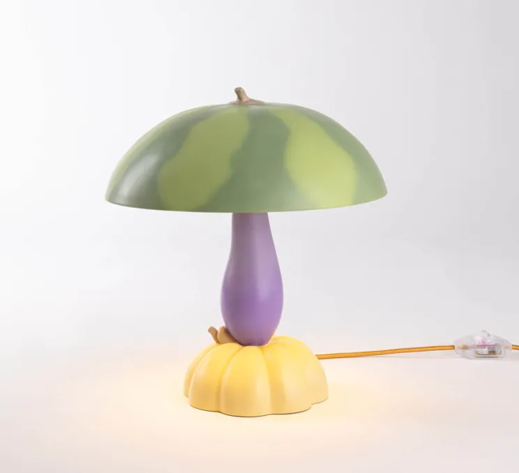La lampe Aubergine se distingue par son esthétique rétro, représentant une aubergine en tant que diffuseur, une pastèque en guise de base et une banane reliant les deux parties. Avec une longueur de 23 cm et une hauteur de 31 cm, elle s’adapte parfaitement à divers espaces. Les couleurs vives de jaune, violet, vert foncé et clair, ainsi que l’intérieur doré brillant, créent une ambiance chaleureuse et joyeuse. Idéale pour un salon, une chambre ou un bureau, cette lampe est non seulement un objet décoratif mais aussi une source de lumière qui apporte de la bonne humeur.