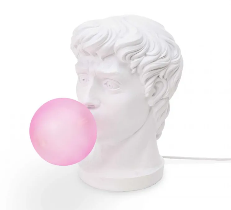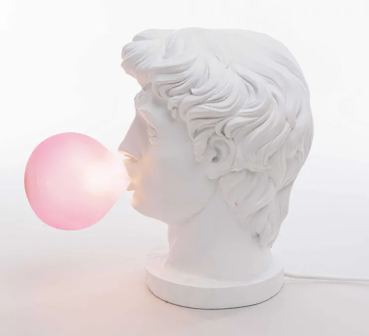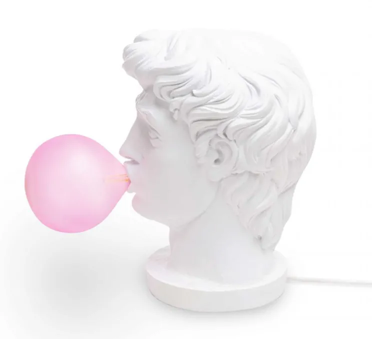 Wonder est la représentation d’une tête de statue grecque classique, soufflant une énorme bulle de chewing-gum et ne sachant pas quoi en faire. Décalé et drôle, ce luminaire est le détail amusant parfait dans une chambre ou dans un salon.