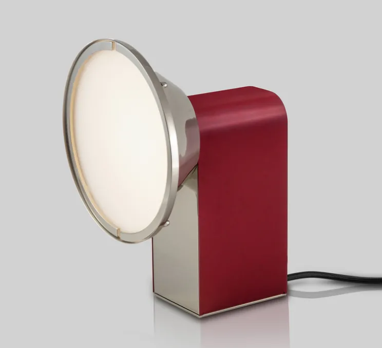 Découvrez la lampe à poser rétro Wonder, finitions nickel poli et rouge foncé, imaginée par Emilie Cathelineau pour la maison française CVL.