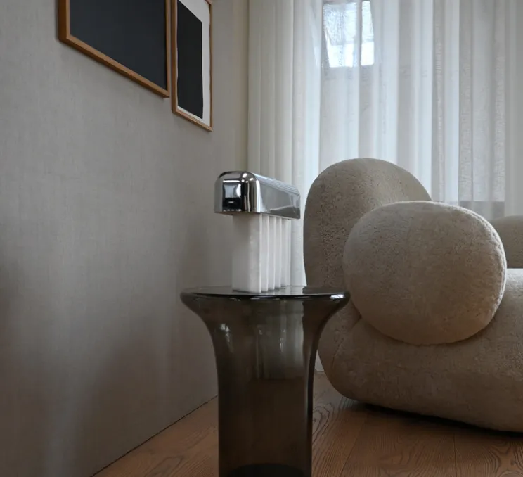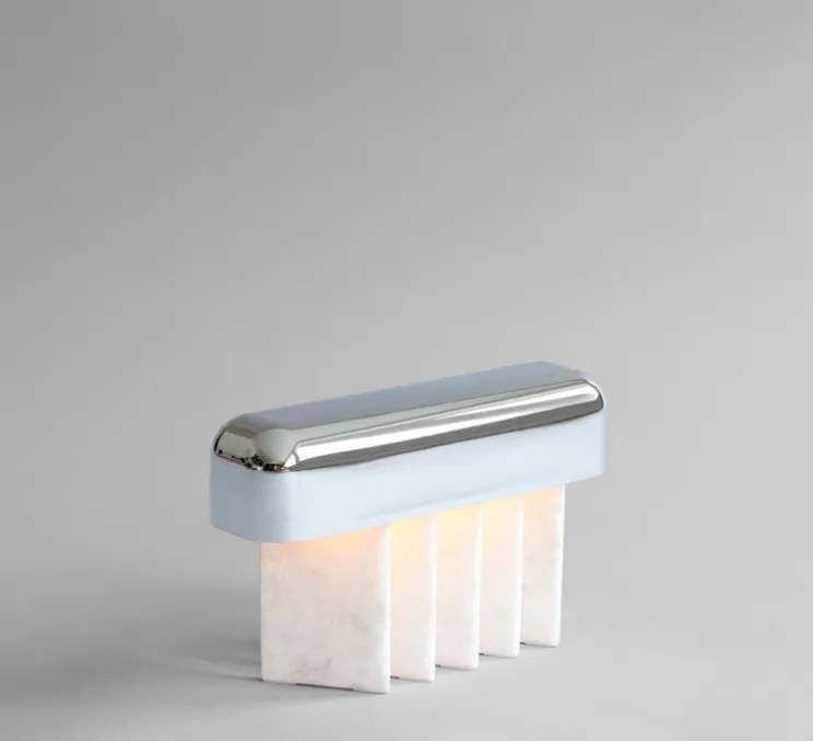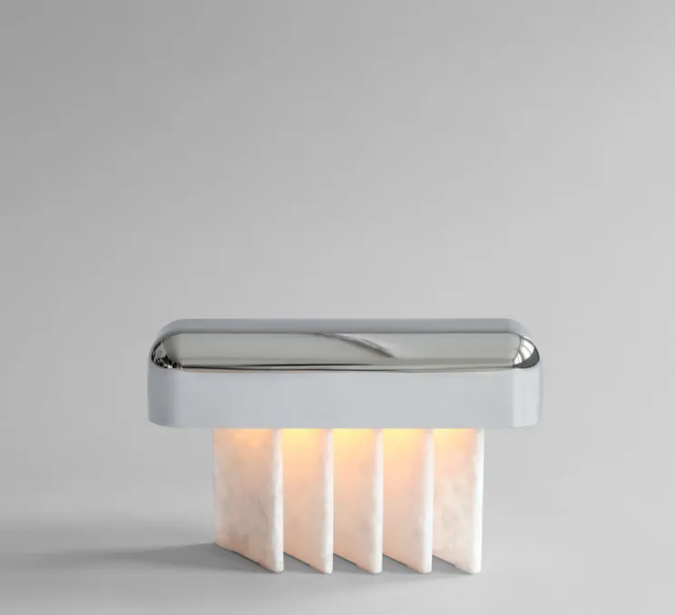 Son abat-jour en métal chromé, légèrement incurvé, repose sur cinq pieds sculptés en marbre cristallisé, laissant filtrer une lumière douce et chaleureuse. Idéale pour créer une atmosphère tamisée, la Beetle trouve sa place aussi bien sur une étagère que sur une table de chevet ou un rebord de fenêtre. Sa silhouette minimaliste et sculpturale s’intègre parfaitement dans un intérieur contemporain, ajoutant une touche d’élégance intemporelle.