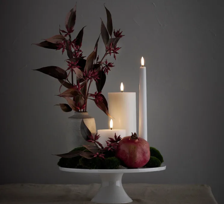 Son aspect cylindrique en polymère recouvert de cire de paraffine vierge imite fidèlement l’aspect d’une bougie classique, avec une flamme 3D brevetée qui apporte une lumière douce et réaliste.