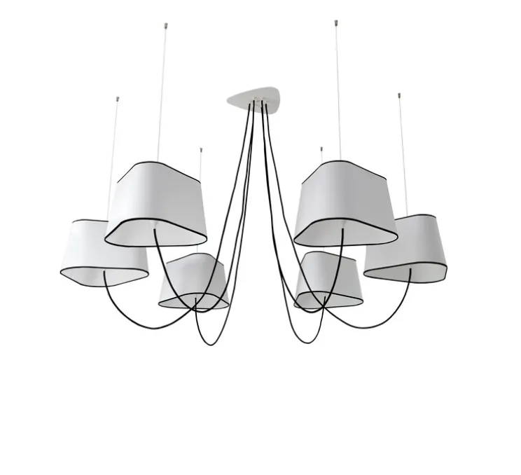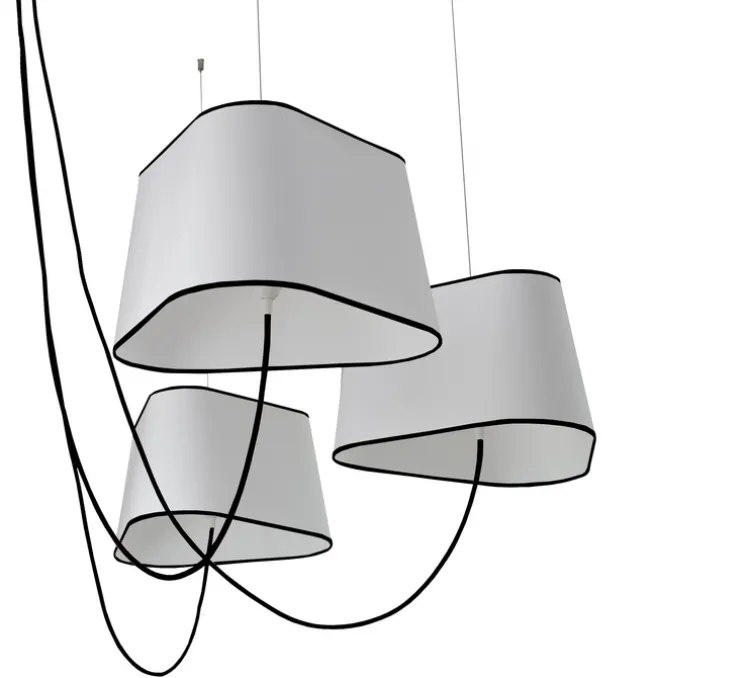 Un lustre réglable en hauteur et en diamètre. Fixés sur des câbles en acier, les abat-jours peuvent être montés ou descendus à volonté grâce à un piston situé sur leur partie supérieure. Modulable en hauteur, ce lustre est aussi ajustable en diamètre total et en forme selon la distance entre les abat-jours choisie. Situés sous les abat-jours, les fils textiles colorés sont aussi des éléments décoratifs.