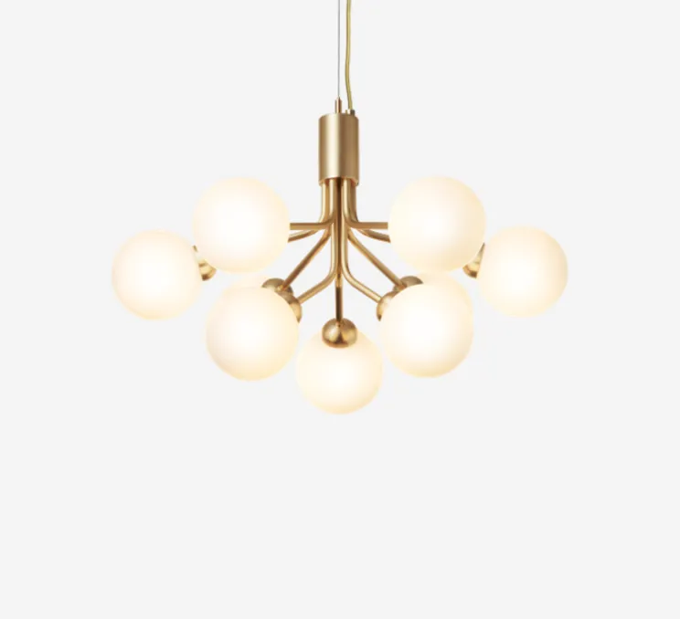 Sofie Refer s’est inspirée de la nature scandinave, les 9 bras de la suspension Apiales rappellent les tiges d’un bouquet d’où la lumière se diffuse gracieusement au travers des globes opalins en verre soufflés à la bouche.