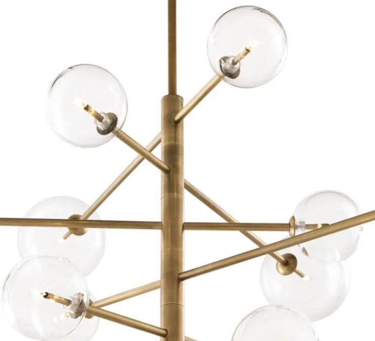 La structure du lustre est en acier, il est doté d’une finition en laiton antique et de 12 globes de verre clair soufflé à la main.