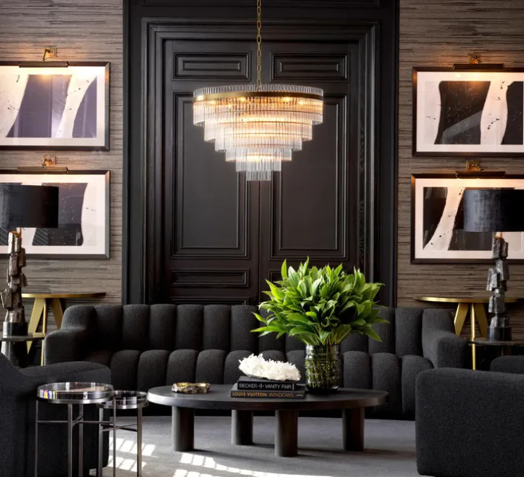 Son volume sphérique, d’un diamètre de 81 cm, se compose de 429 tiges de verre transparent disposées en niveaux effilés autour d’un cadre en laiton antique. Ce jeu de transparence capte la lumière et crée une diffusion douce à 360 degrés. Le lustre East trouve sa place au-dessus d’une table ronde, dans un salon haut de plafond ou dans un hall pour valoriser l’architecture d’un espace. Il s’harmonise avec des matériaux minéraux ou des ambiances inspirées des années 1920-1930.