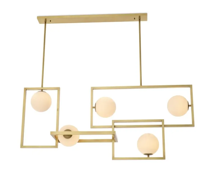 Le luminaire en finition laiton antique est suspendu à deux tiges réglables en hauteur. Des barres horizontales et verticales soutiennent les sphères en verre blanc pour créer une atmosphère chaleureuse qui apporte un style contemporain.
