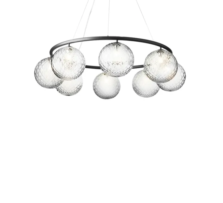 Ce fabuleux lustre aux formes pures nous dévoile huit sphères en verre soufflé transparent suspendues par des fils et d’un anneau en métal laqué de couleur noir au travers desquelles la lumière se diffuse gracieusement.