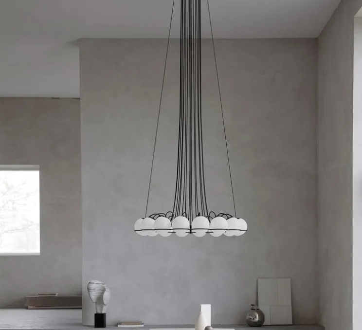 En effet, le fondateur d’Astep, Alessandro Sarfatti, a voulu rendre hommage à son grand-père en rééditant ces œuvres. Avec ses 16 verres opalins sphériques avec une structure couleur noire, ce lustre fait partie de la collection iconique de Gino Sarfatti. Ce luminaire a été conçu initialement en 1959 et a été réédité en 2018 !