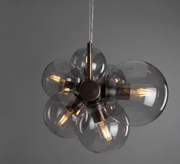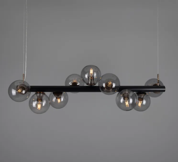 L’esthétique du Moriarty est un mariage réussi entre le style art déco et une touche contemporaine. Les neuf globes en verre fumé apportent une lumière diffuse et chaleureuse, idéale pour illuminer votre îlot de cuisine ou sublimer un espace dans un hôtel ou un restaurant de luxe.