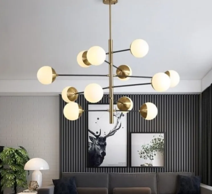 Cette réinterprétation asymétrique d’un design moderne du milieu du siècle rehaussera instantanément le style de votre pièce. Agrémenté d’une finition laiton antique, ce plafonnier possède 12 globes en verre blanc.