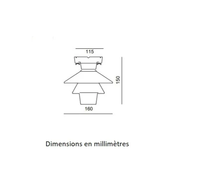Le plafonnier mesure 15 cm de hauteur et 16 cm de diamètre. La base mesure 11,5 cm de diamètre.