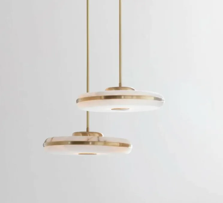 Les suspensions Beran sont disponibles en 2 tailles 26 cm et 36 cm de diamètre ainsi que 4 finitions, laiton brossé, laiton antique, bronze sombre et nickel satiné.