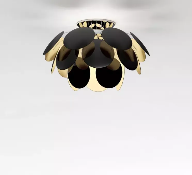 Ce plafonnier est idéal dans des pièces à plafond bas. Il est composé d’une rosace de plafond ronde, d’un cordon d’alimentation et de câbles d’élingue supportant un abat-jour constitué d’une structure sphérique chromée distribuant 35 pétales en abs.