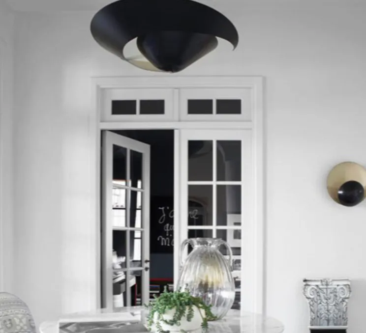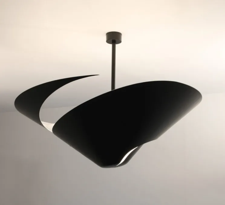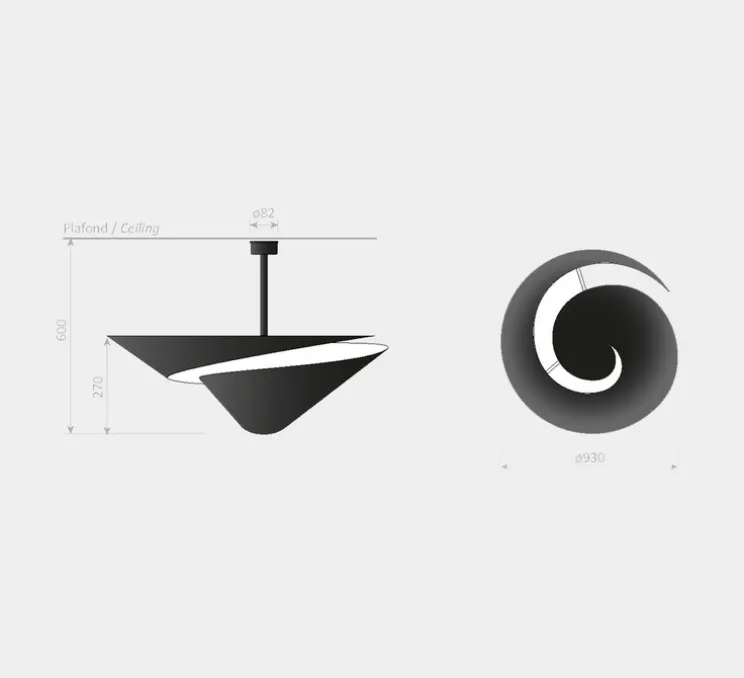 Avec sa forme unique en spirale, ce plafonnier s’impose comme un élément décoratif fort. Son cône de 93 cm de diamètre en aluminium noir et son boîtier rond apportent une touche élégante et contemporaine à tout espace. Que ce soit dans un salon, une salle à manger ou un bureau, il se distingue par sa présence et peut être magnifiquement mis en scène, y compris en applique murale pour une ambiance différente.