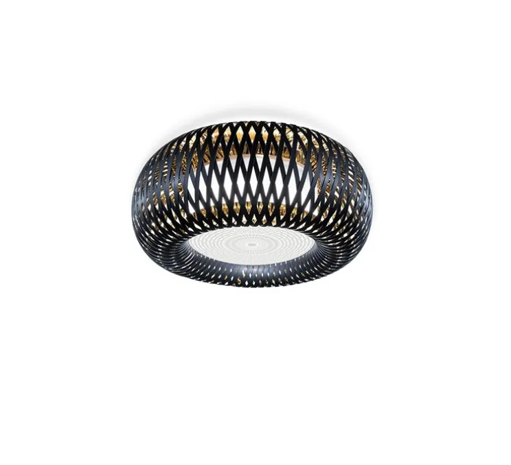 Voici le plafonnier Kalatos de la maison italienne Slamp, ce luminaire est contemporain de par sa couleur noire et dorée à l’intérieur et de par ses formes géométriques qui le compose.