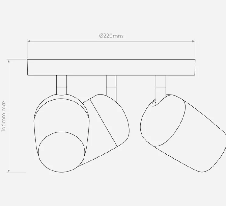 Ce plafonnier mesure 22cm de diamètre et 16,6cm de hauteur. Il nécessite trois ampoules Led GU10 d’une puissance maximale de 6W qui ne sont pas fournies. Montage au plafond ou montage mural. Driver non requis. Rotation des spots à 330° et orientation verticale à 90°. Dimmable selon l’ampoule.