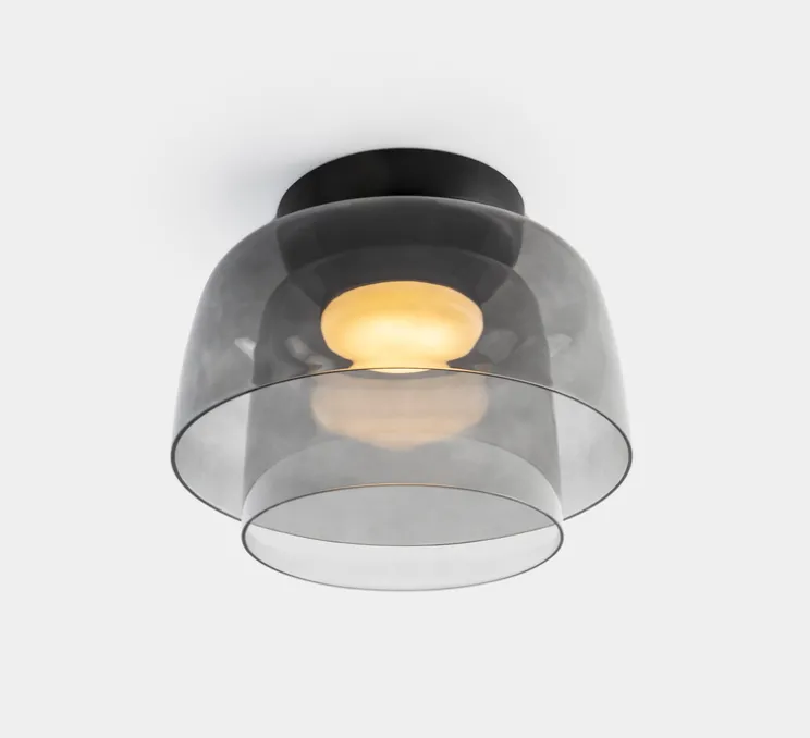 Avec sa composition de deux abat-jour en verre finition fumé, Levels mesure 32 cm de diamètre et 28 cm de hauteur.