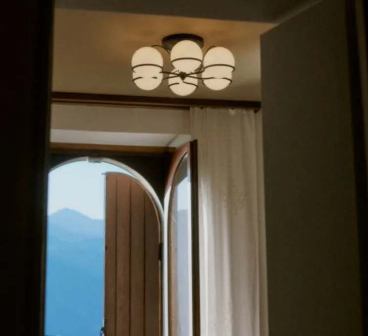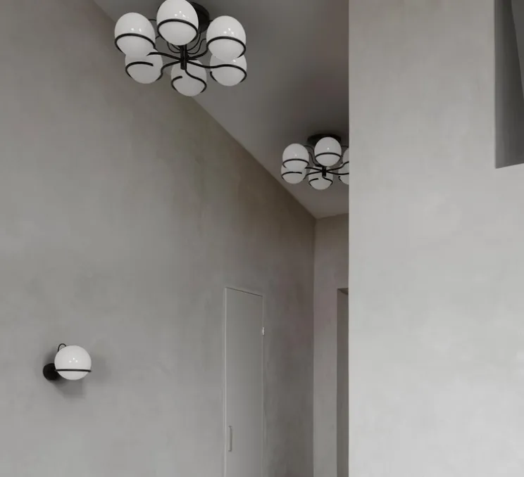 Ce plafonnier raffiné est composé de six sphères en verre opalin soufflé soutenues par une monture et une structure en acier peint en finition noire ou champagne. Ces sphères s’inspirent de la poésie naturelle de la Lune et capturent la délicate lumière lunaire dans un design gracieux.