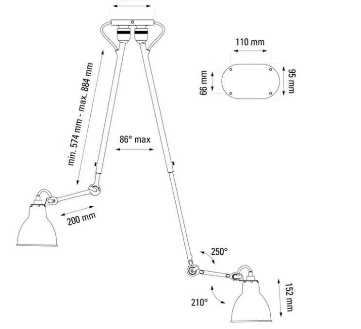 Composée de deux bras en acier noir et réglables de 57,4 cm à 88,4 cm et deux abats-jour cylindriques de 15,3 cm de diamètre, ce plafonnier vous permet d’orienter l’éclairage suivant vos besoins. L’angle d’ouverture des 2 bras et des abats-jour est également réglable.