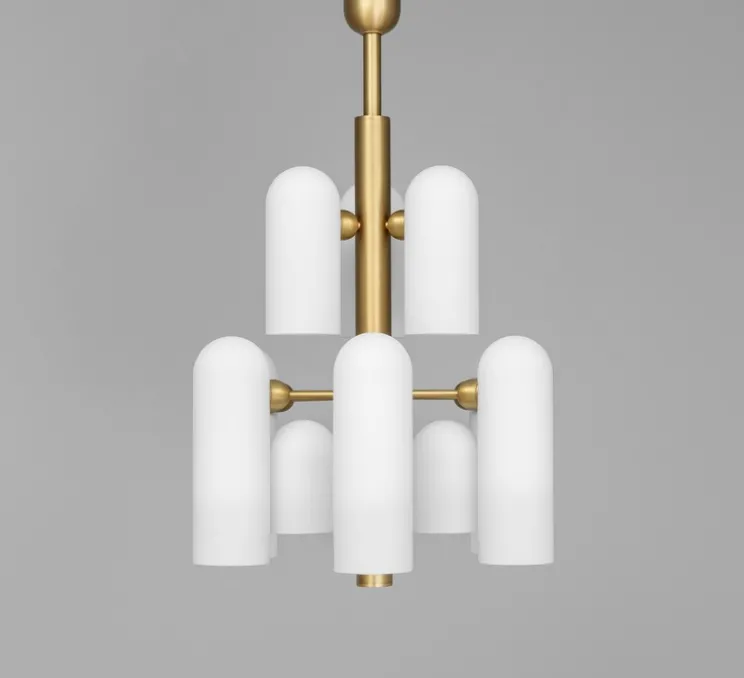 Ce lustre se compose de rayons de laiton soutenant 12 abat-jour en verre mat. Le cercle de lumière crée un effet planétaire dans ce lustre rond saisissant. Les abat-jour de différentes dimensions donnent du rythme et de l’équilibre à l’ensemble. Les dômes en verre s’associent à une structure épurée et linéaire pour former une cascade lumineuse fascinante.