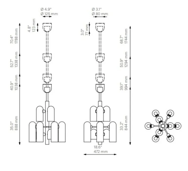 Le lustre mesure 47,2 cm de diamètre et 84,4 cm de hauteur. Il est livré avec plusieurs tiges pour ajuster sa hauteur. Les sources lumineuses sont fournies.