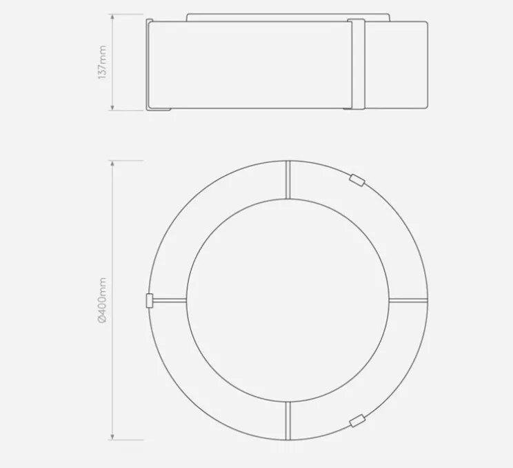 Le plafonnier Salina 400 mesure 40cm de diamètre et 13,7cm de hauteur. Les deux ampoules E27 d’une puissance maximale de 12W ne sont pas fournies mais sont recommandées pour le bon fonctionnement du luminaire. Abat-jour inclus. Dimmable selon l’ampoule. Driver non requis. Montage au plafond.