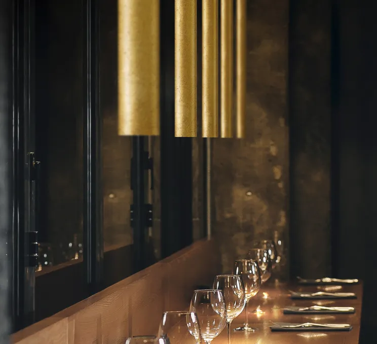 La structure en aluminium est peinte en laiton. Elle a une hauteur de 45cm et un diamètre de 5,5cm. La source de lumière de type LED n’est pas comprise avec le luminaire, elle diffuse une lumière de 2700 kelvins et 836 lumens.